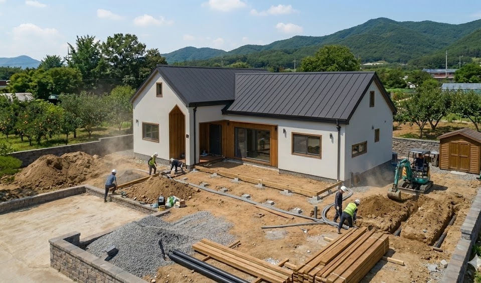 부지 정리 및 레벨 잡기: 불필요한 적치물을 제거하고 설계도에 따라 땅의 높낮이를 조절합니다.