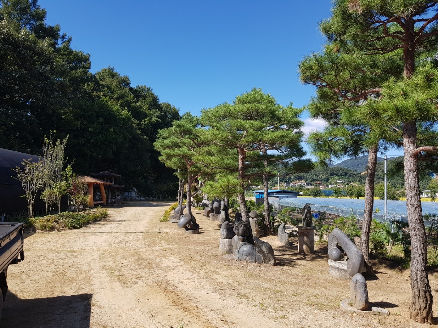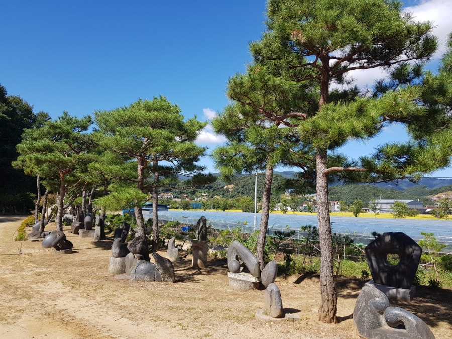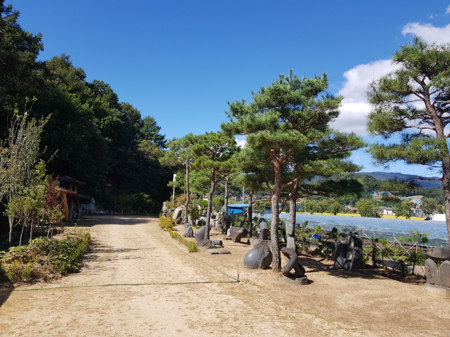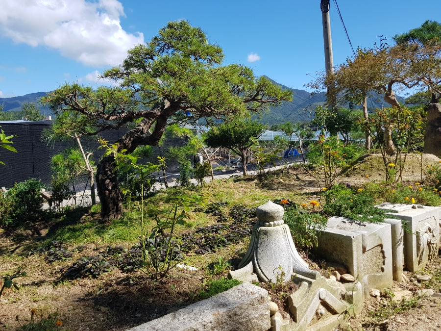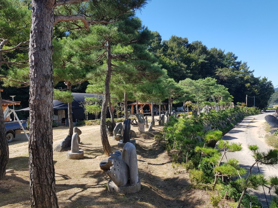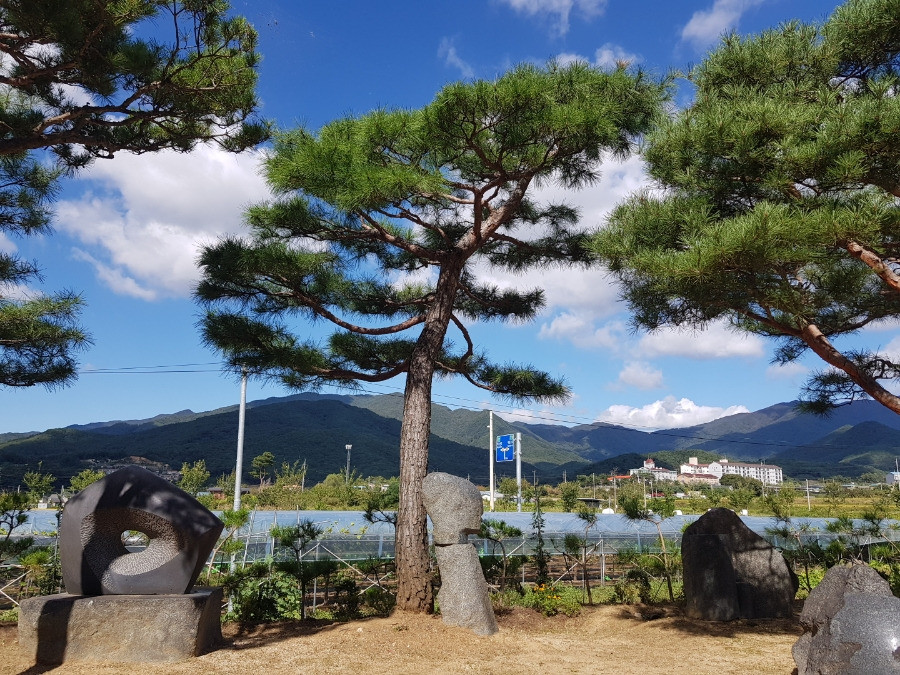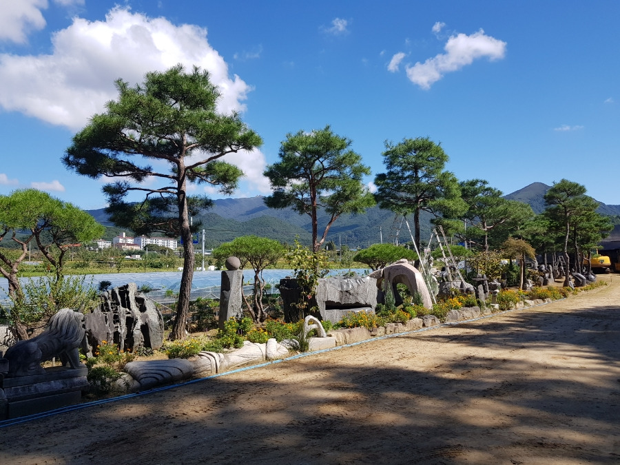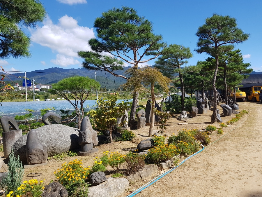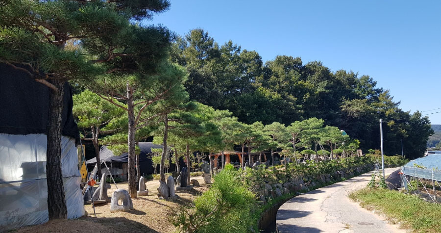 소나무 아래 돌조각품이 보이는 정원조경 소나무