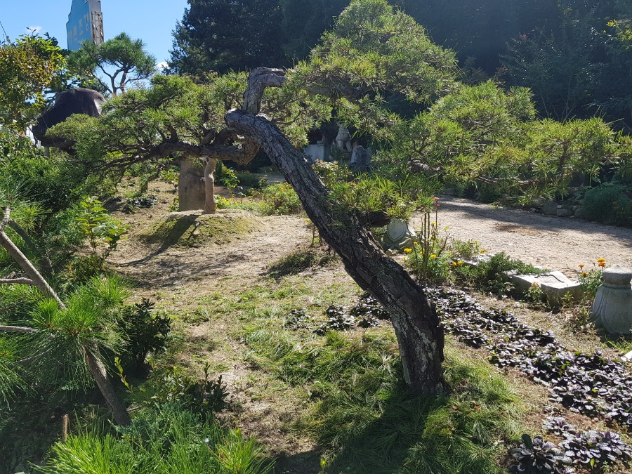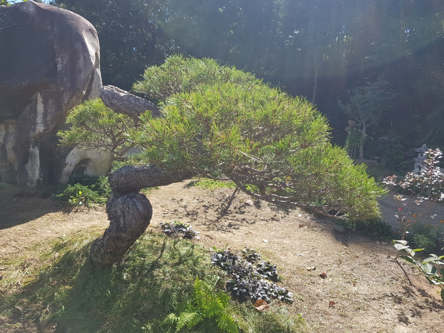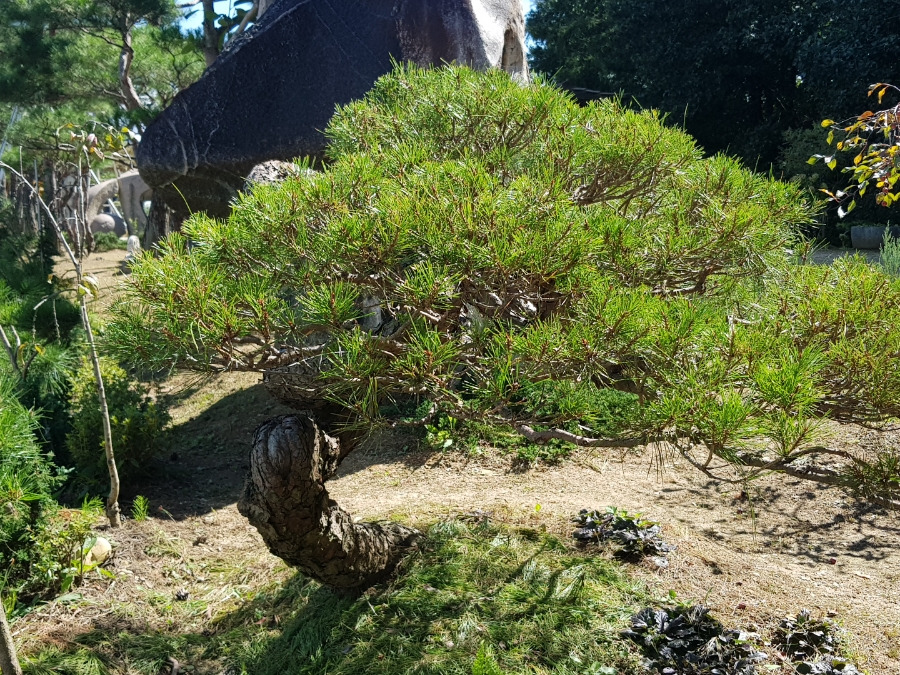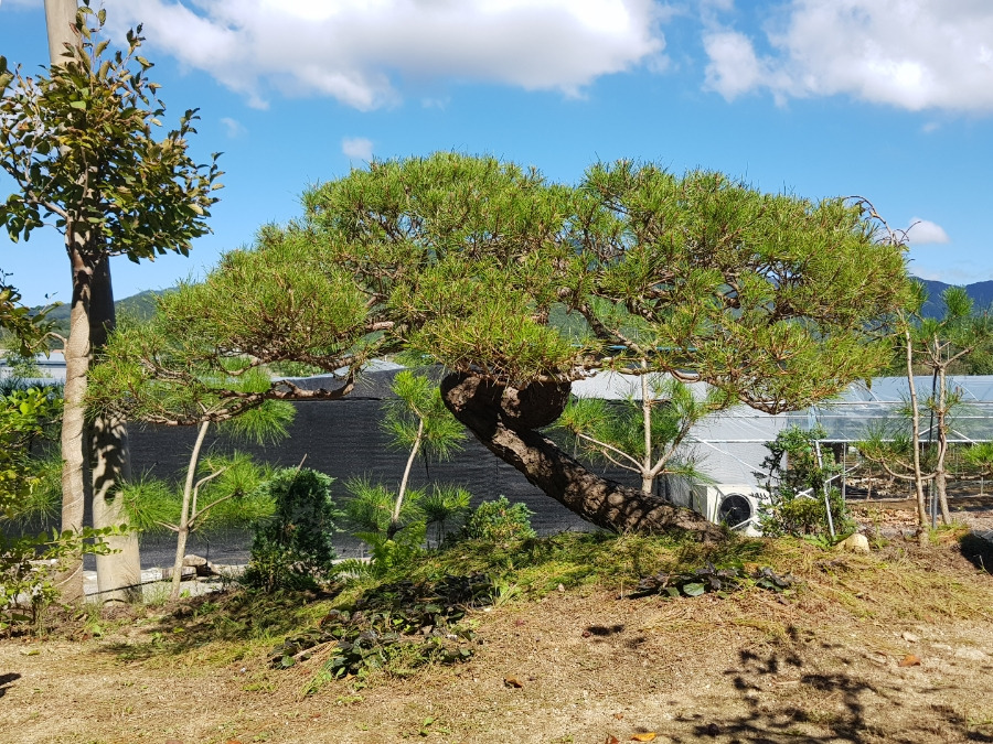 반송인데 아래 굵은 가지를 장기간에 걸쳐서 쳐내고 가지 사이로 시원하게 경치가 보이도록 처리한 한 반송입니다.