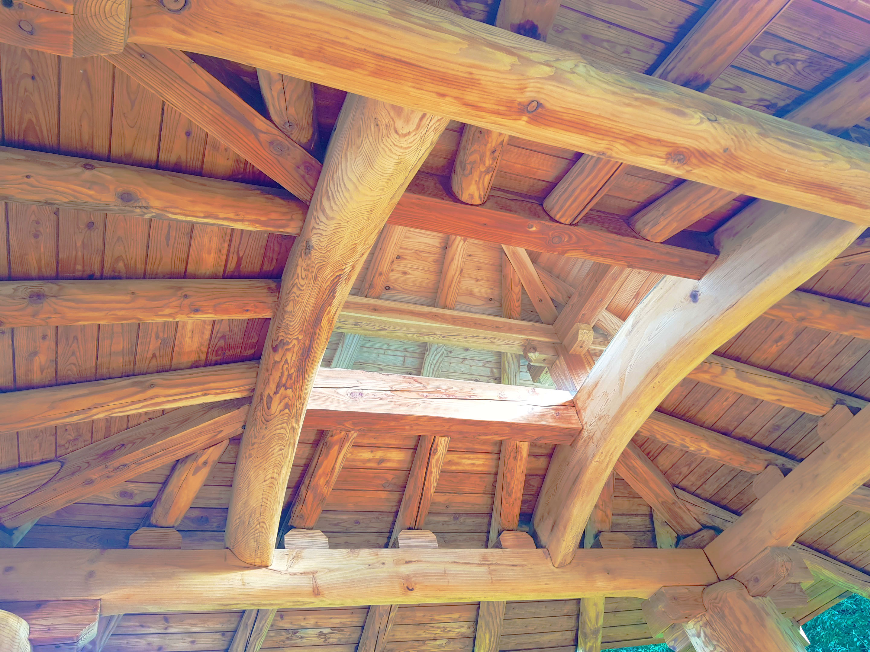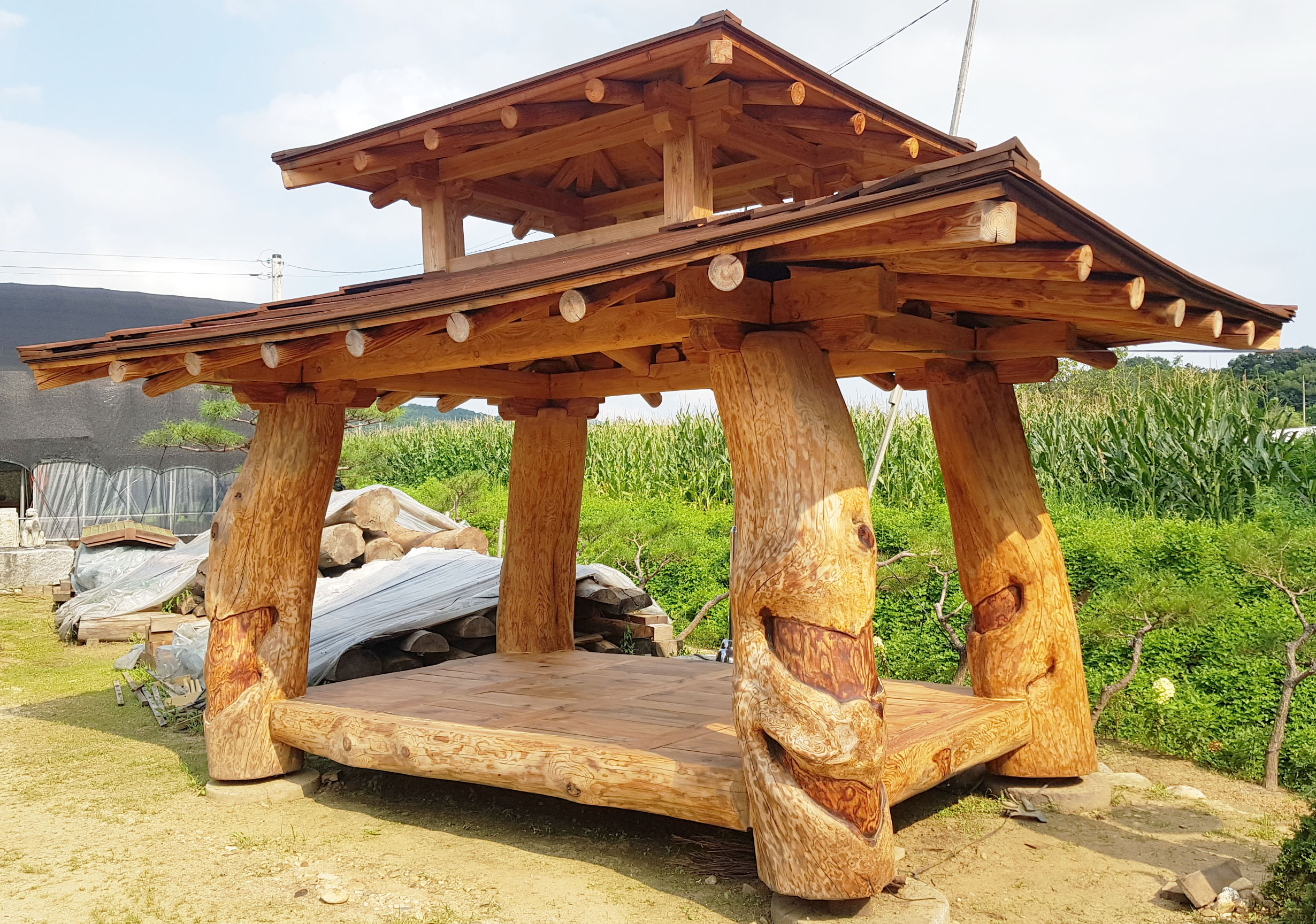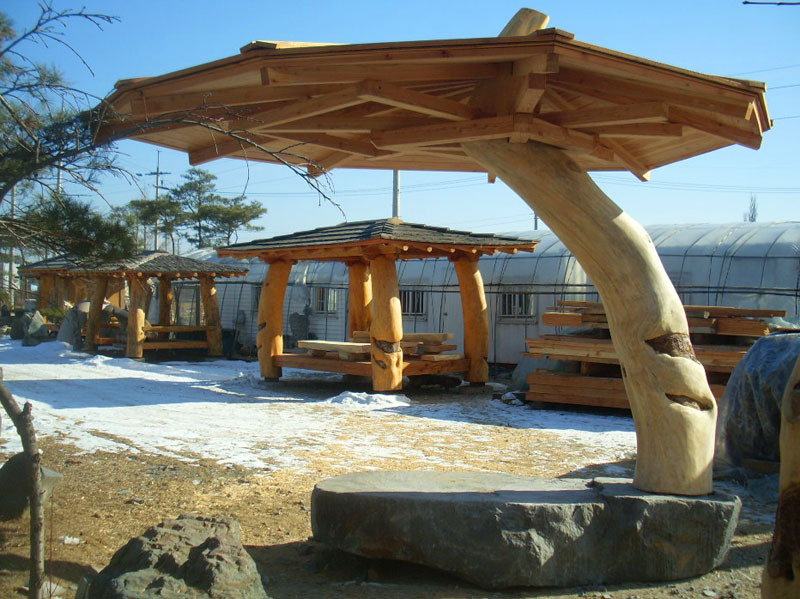 우리의 원두막과 정자는 도면 위의 자(Ruler)로 그려낼 수 없습니다. 제멋대로 휜 듯한 기둥은 사실, 가장 자연스러운 힘의 균형을 유지하고 있습니다. 휘어진 소나무(Red Pine)의 역동적인 선은 지붕의 처마 선과 어우러져 마치 춤을 추는 듯한 리듬감을 만들어냅니다. 인위적인 가공을 거부하고 자연이 빚어낸 형태를 그대로 살린 기둥은, 바라보는 위치에 따라 매번 다른 표정을 보여주는 하나의 조각품입니다.