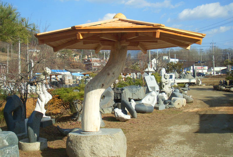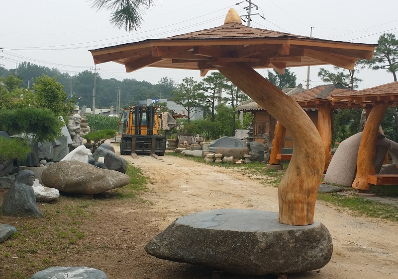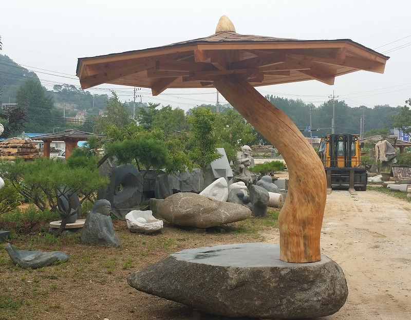 소재의 대비: 상부의 지붕은 나무 기와나 널빤지 형태로 마감되어 전통적인 정자의 지붕 모양을 현대적으로 재해석했습니다. 이 목재 구조물은 거대한 자연석 위에 얹혀 있습니다. 이 돌과 나무의 대비는 자연적인 재료를 사용하는 한국 전통 건축 및 조경의 미학을 따르면서도, 파라솔이라는 현대적인 용도를 부여합니다.
