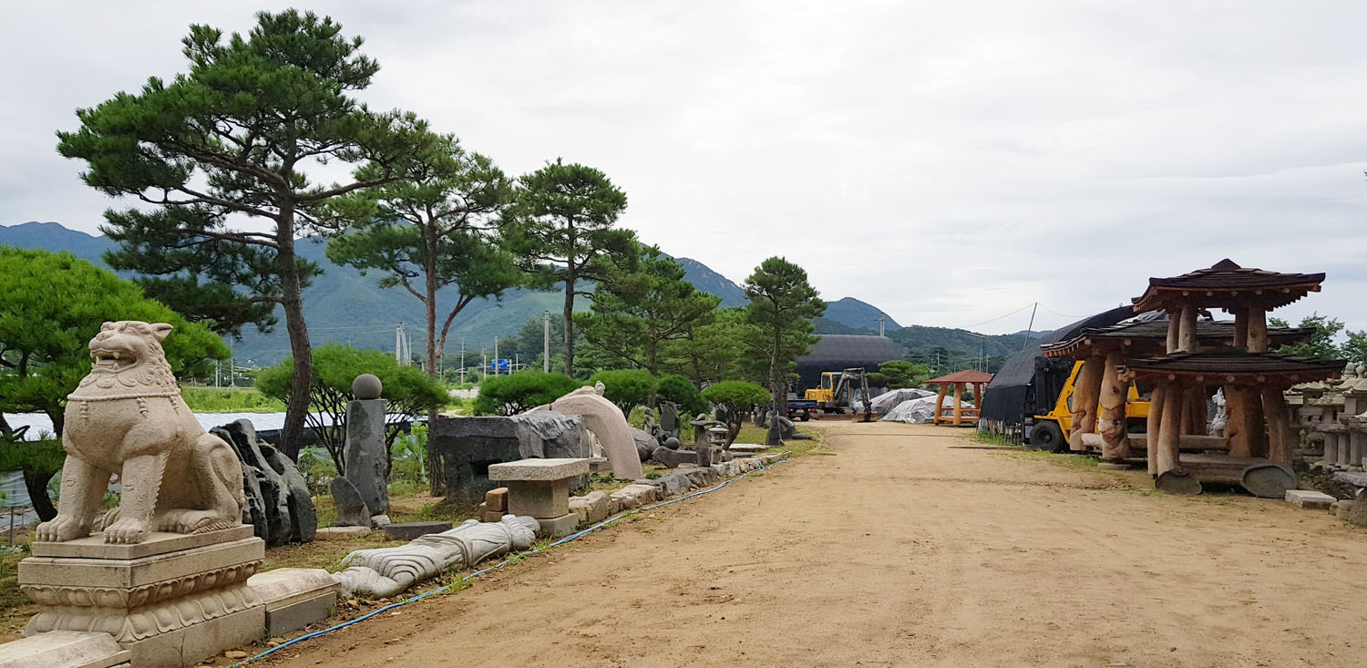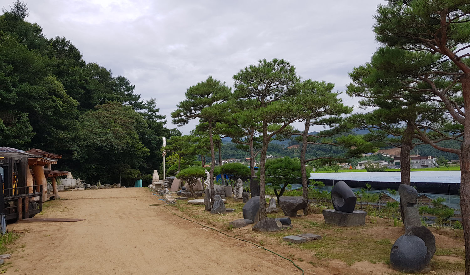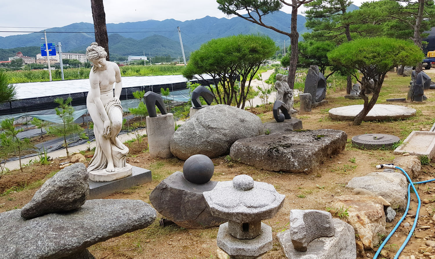 소나무 아래 정원조각과 원두막