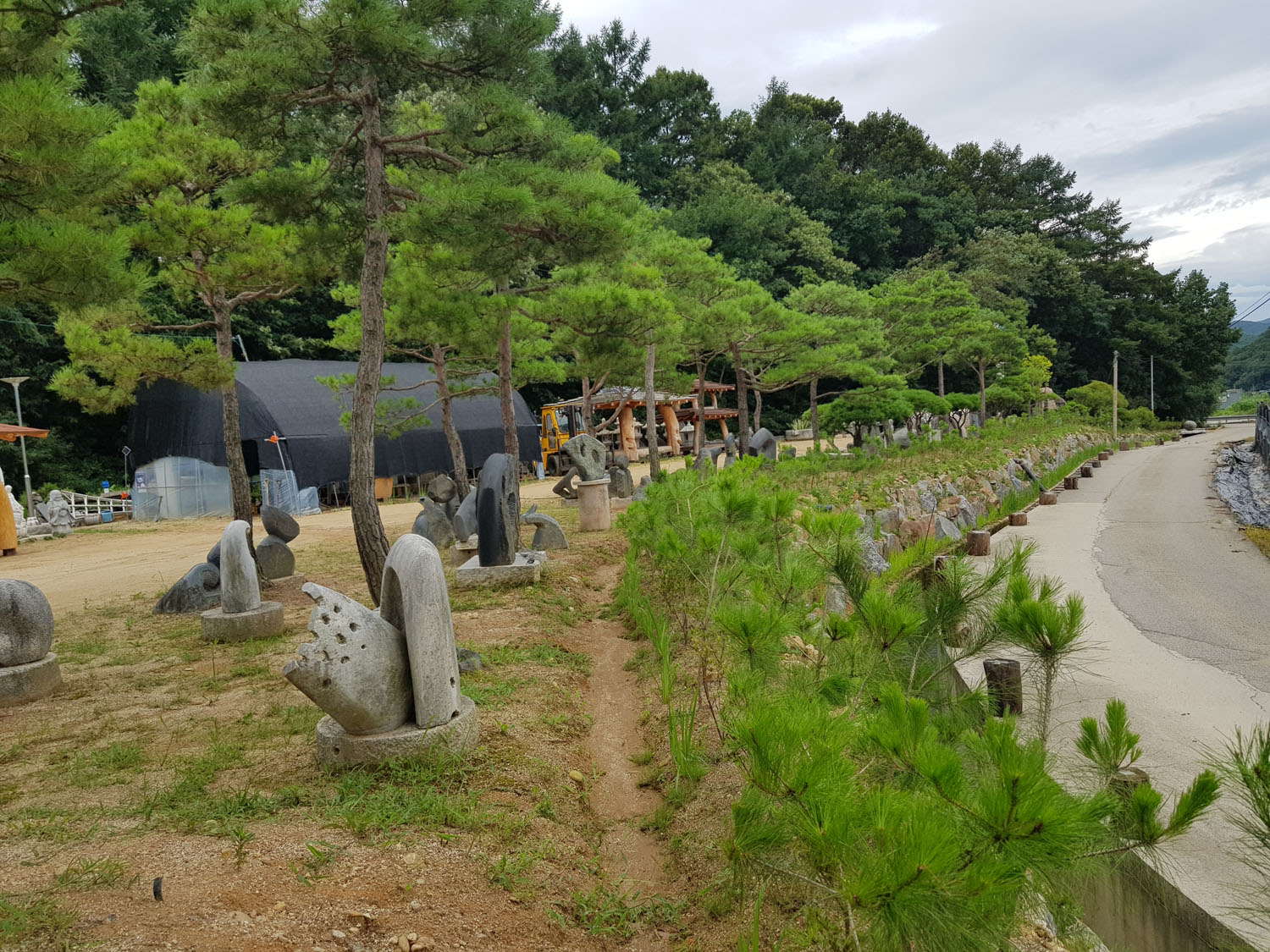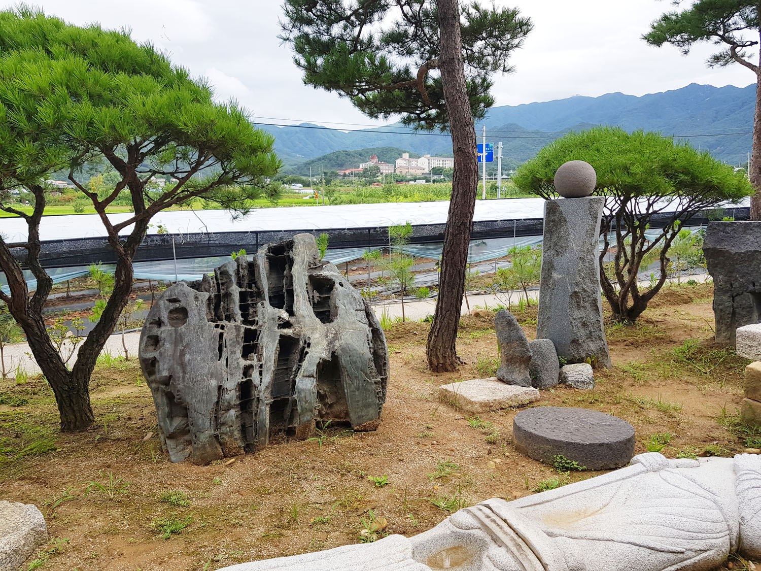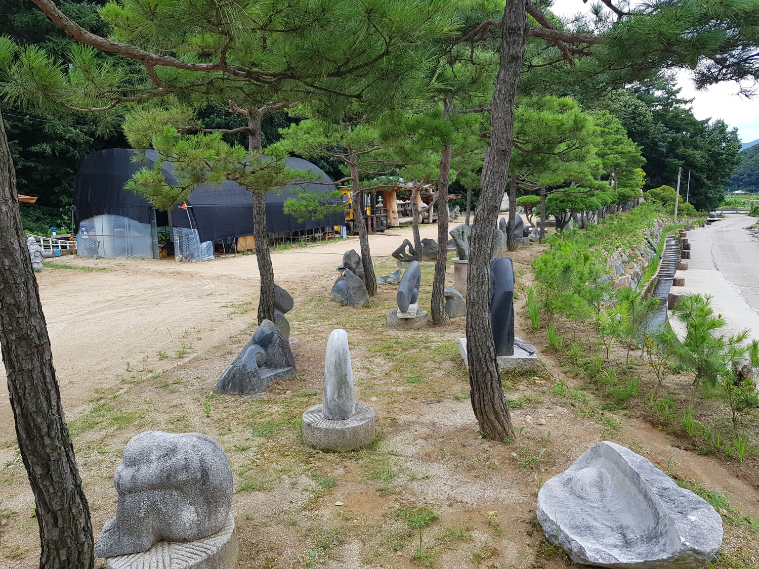 소나무 아래 정원조각과 원두막