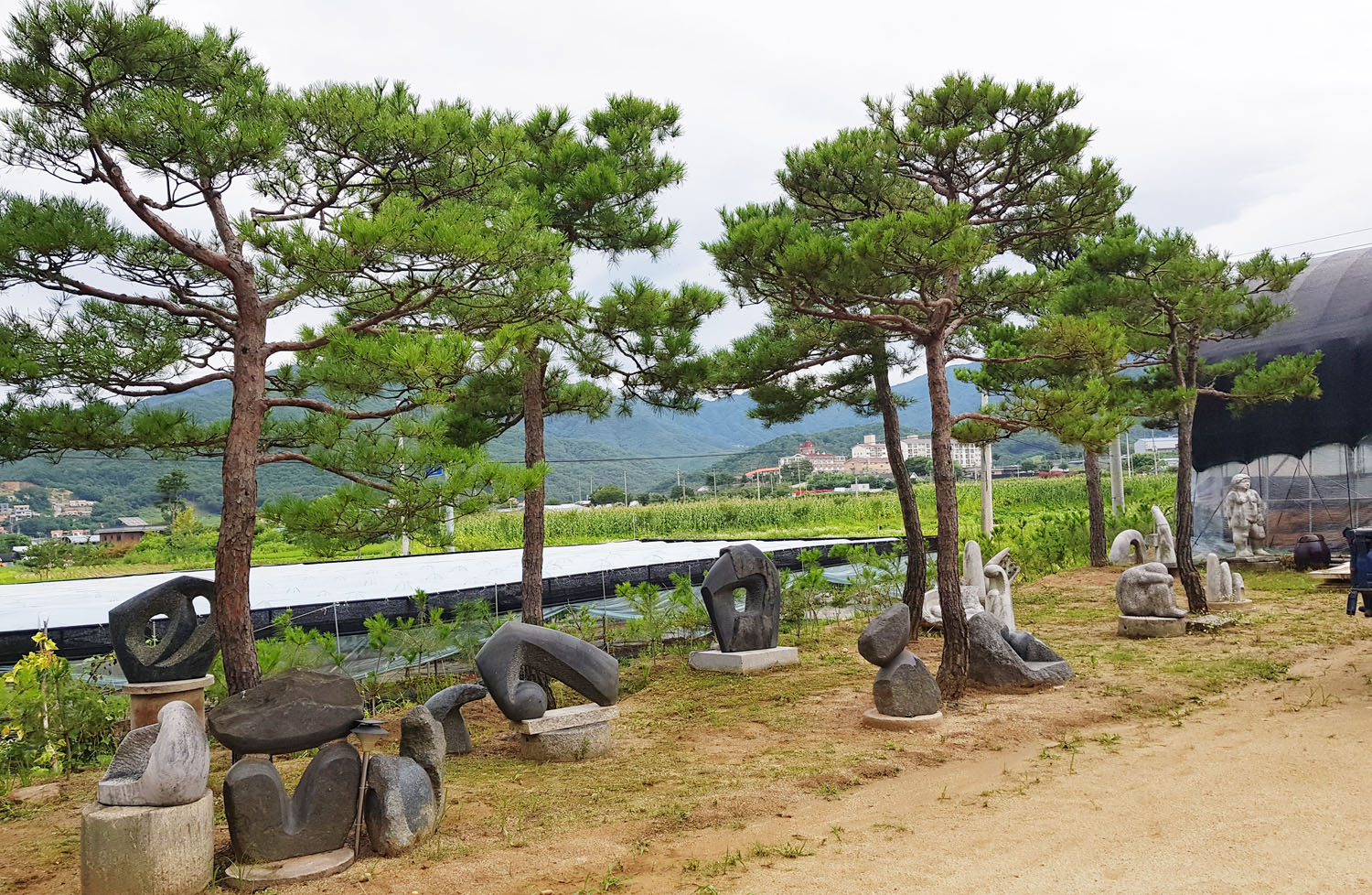 소나무 아래 정원조각과 원두막
