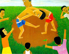 우리는 단원 김홍도의 작품속에 깃들어 있는 그 놀라운 해학정신을 목격할 때가 많다. 단원은 자신이 표현하고자 한 대상과의 거리를 유지하며 작품속에 당대의 삶의 풍속을 가장 정직하게 그려내었던 거장이다. 특히 "씨름"을 보면 씨름에 열중하고 있는 두 장정과 그들의 경기를 응원하고 있는 관중과는 아랑곳없이 엿판을 메고 있는 천진한 총각을 통해 비속한 일상을 넘쳐나는 재치와 활달한 필치로 그려내고 있음을 알 수 있다.